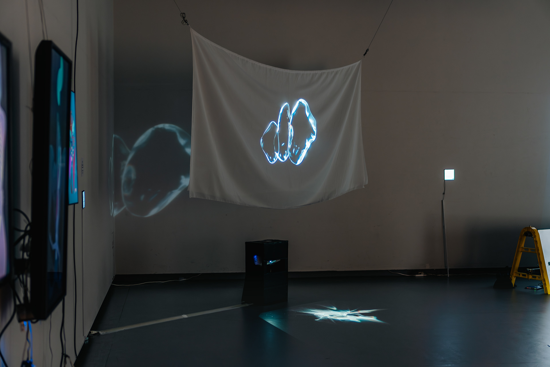 加えて、半透明な布をスクリーンに使用することで、後ろの壁にも"実体"が投影され、裏側に回って鑑賞することができます。布を通過して後ろの壁へ投影されたもう一つの"実体"を見たり、布の裏側に反転して浮かび上がっている像と展示室の空間とを重ねて見てみたり、さまざまな角度から近づいたり遠のいたりしながら鑑賞することも可能です。